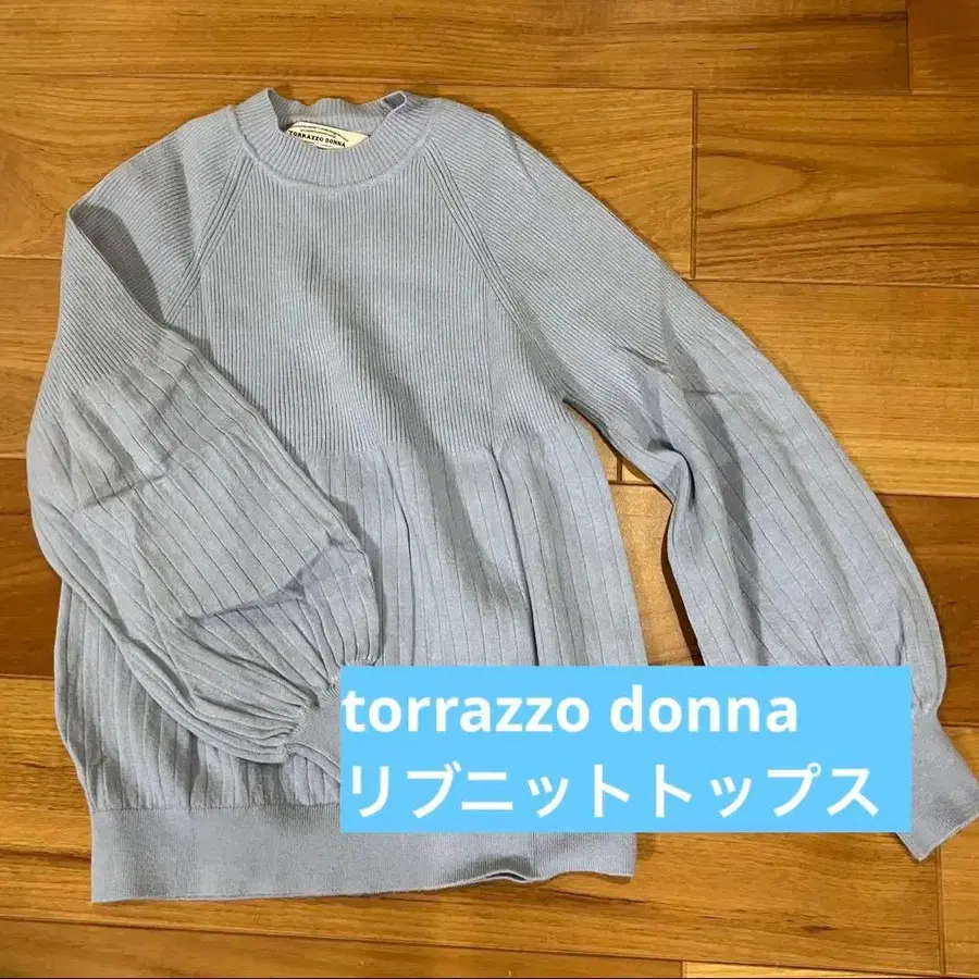 리브 편직의 라이트 블루 스웨터, 벌룬 슬리브 디자인으로 캐주얼에 최적.