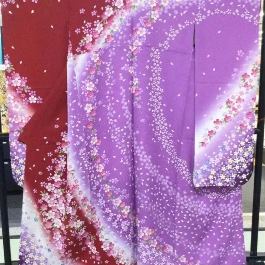 빨간색과 연보라색 계열에 벚꽃 패턴의 후리소데입니다.