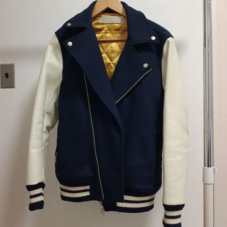 울 가죽 더블 라이더스 바시티 자켓 네이비