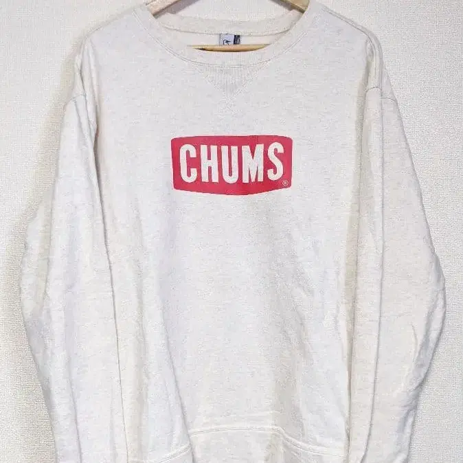 자동 번역되었어요. 원문보기CHUMS 로고가 특징인 크림색 크루넥 트레이닝복.