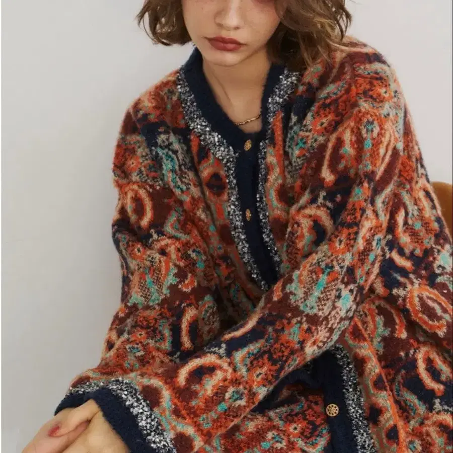 부클레 총무늬 자카드 니트 가디건 스커트 세트