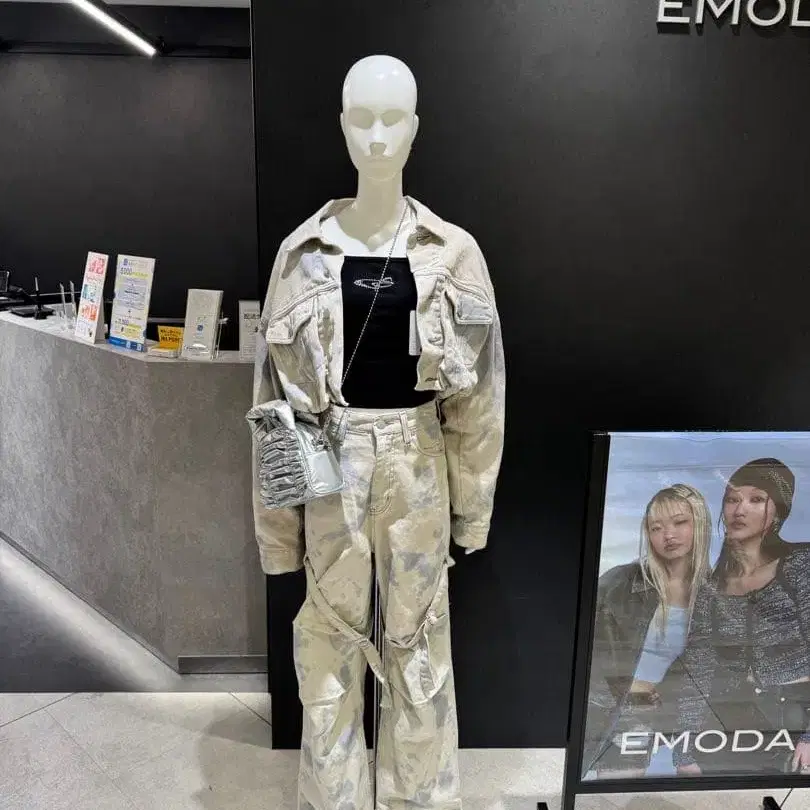 EMODA 카고 벨트 루즈 청바지, 벌룬 컴팩트 데님 블루종