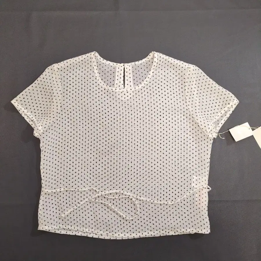 화이트 베이스에 블랙 별 패턴이 돋보이는 시원한 반팔 블라우스입니다. 얇은 폴리에스테르 소재이며, 허리 부분의 리본이 악센트가 되어줍니다. 등 쪽에 버튼이 달린 고급스러운 디자인입니다.