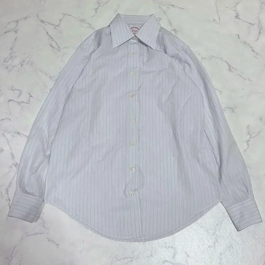 자동 번역되었어요. 원문보기스카이블루와 옅은 핑크 스트라이프 디자인의 긴팔 버튼 다운 셔츠.