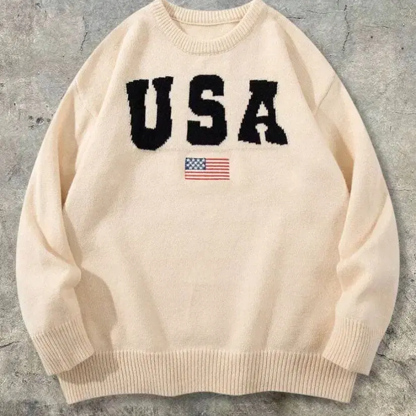 USA 성조기 니트 스웨터 애프리콧 크림색