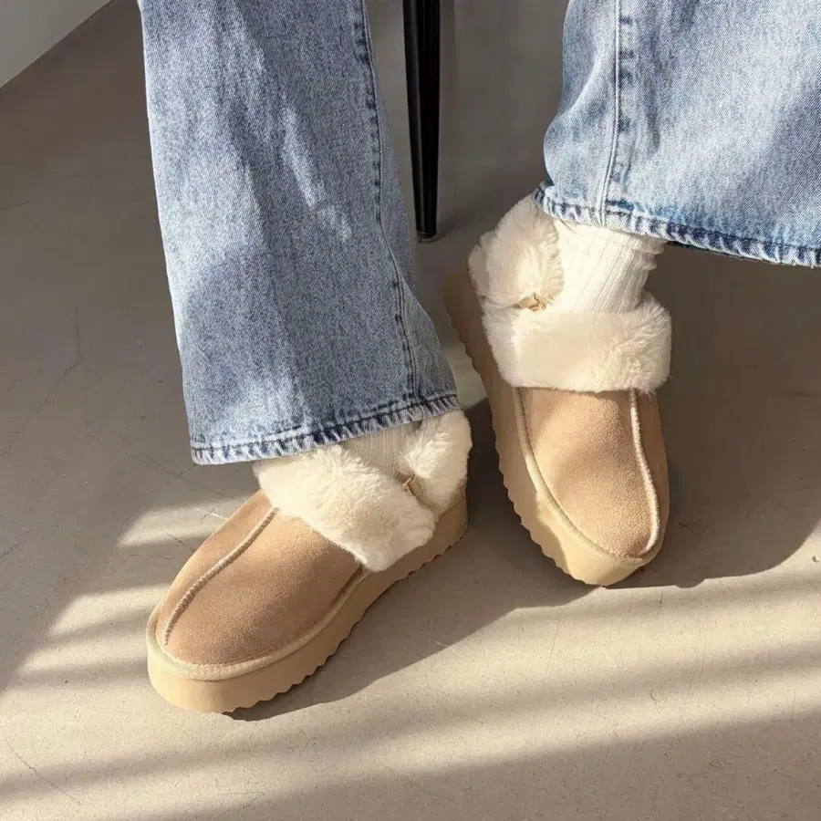 풍성한 퍼로 보기만 해도 따뜻한 통굽 무스탕 샌들은 방한성이 뛰어난 아이템입니다.