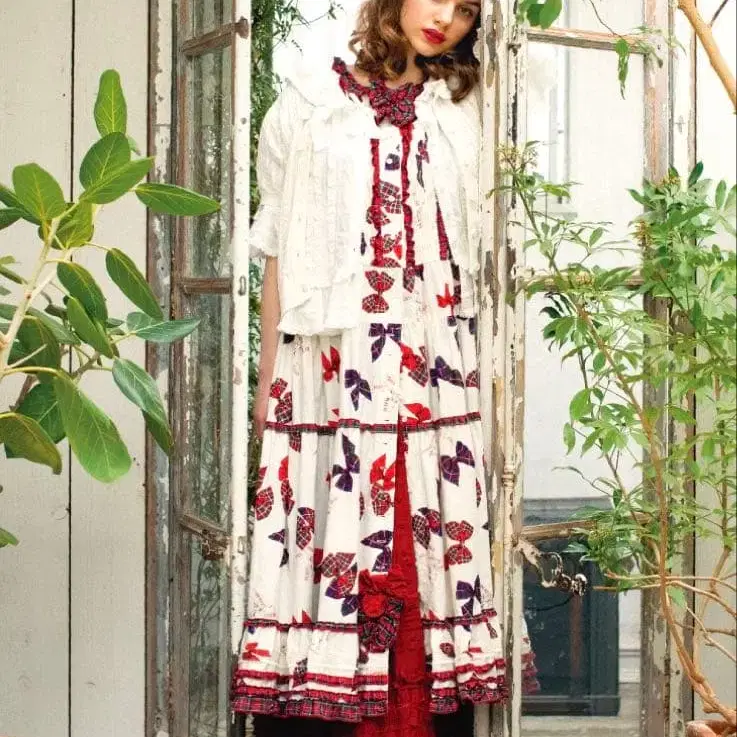 핑크하우스 리본 무늬 롱 원피스 반팔