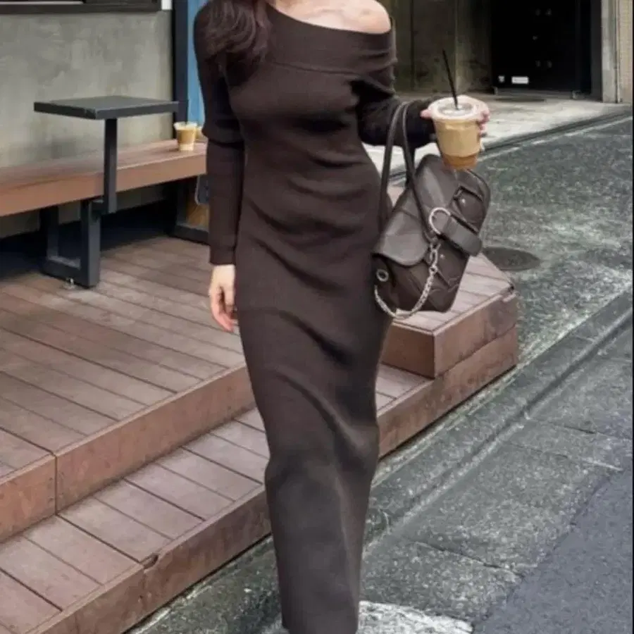 리엔다 원숄 니트 원피스 리엔다 다크 브라운