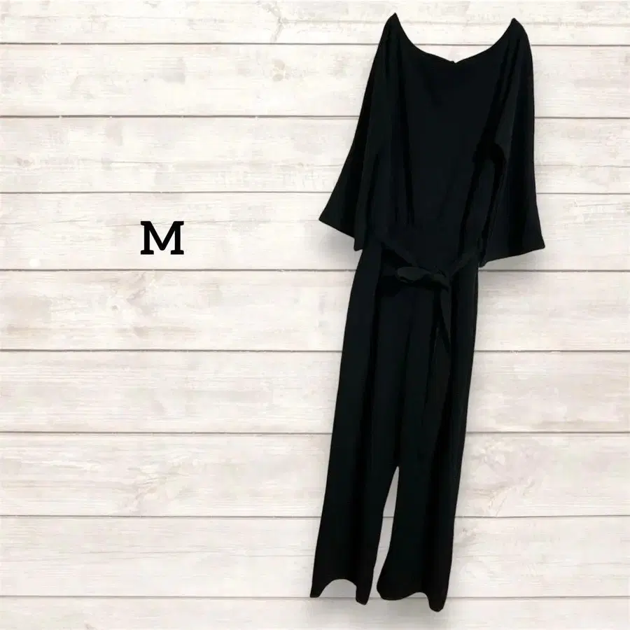 블랙 올인원입니다. 깔끔한 디자인으로, 앞뒤의 심플한 라인이 세련된 인상을 줍니다. 허리에는 끈이 달려 있어 취향에 맞게 핏감을 조정할 수 있습니다. 택은 없지만, 전체적으로 눈에 띄는 데미지 없이 새상품급 상태입니다.