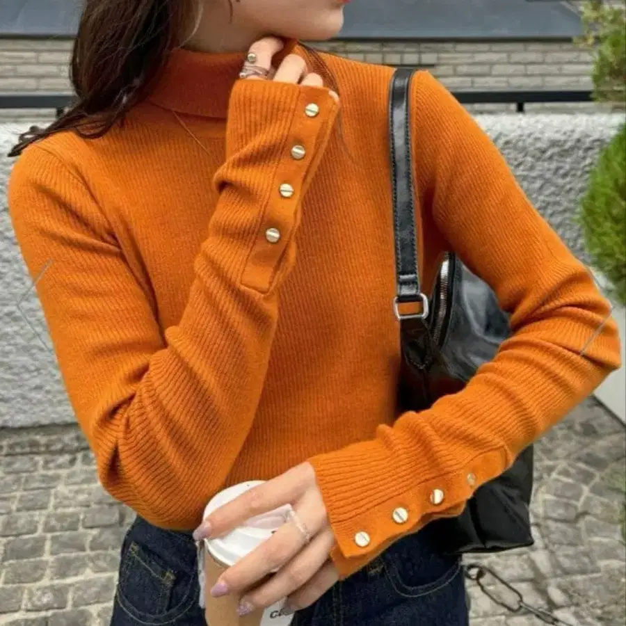 새상품급! DISCORT 리브 소매 버튼 터틀 오렌지