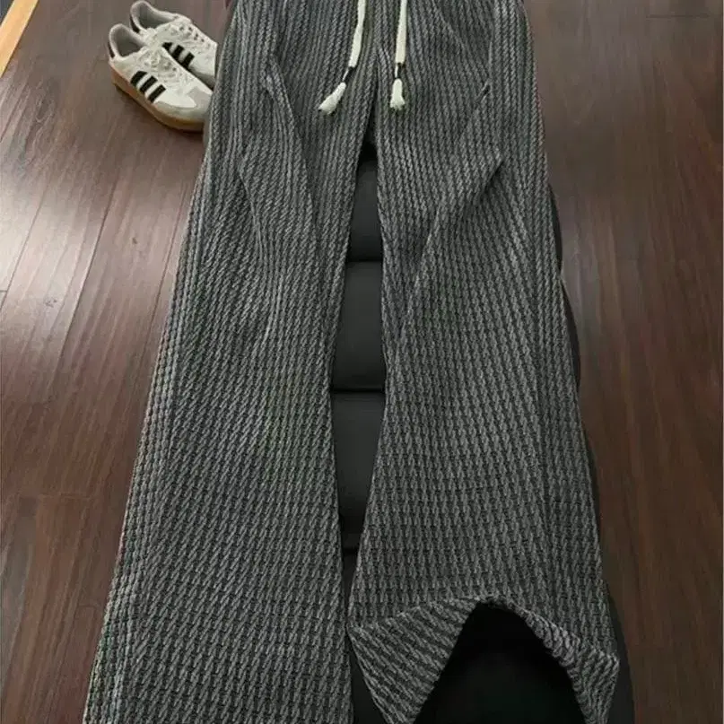 스트라이프 패턴 그레이 니트 팬츠 (허리밴딩 & 드로우 스트링)