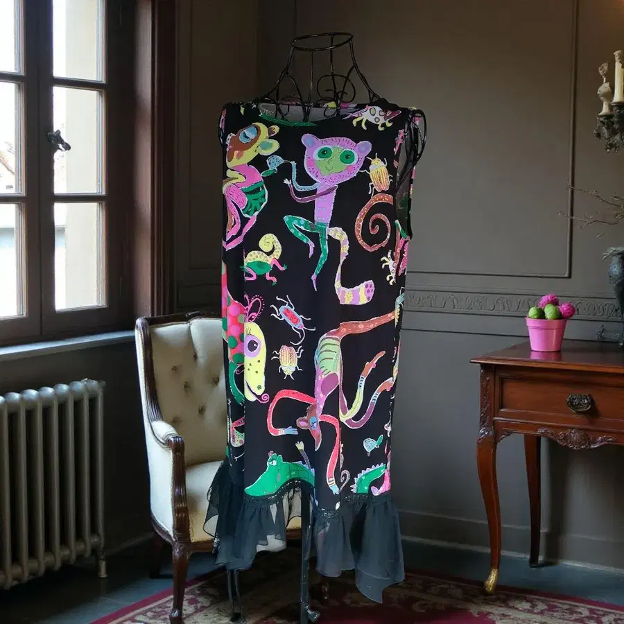 토쿠코 밑단 프릴 애니멀 무늬 튜닉 미니 원피스