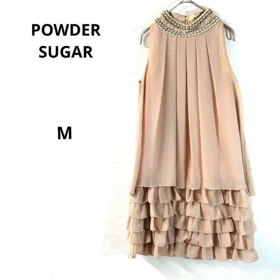 비즈 장식, 프릴 넥라인, 밑단이 특징인 파우더 슈가 M 사이즈 플레어 드레스. 쉬폰풍의 가벼운 원단입니다.