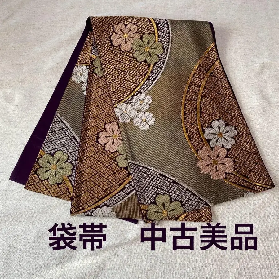 골드 컬러와 보라색 꽃무늬 후쿠로 오비 육통