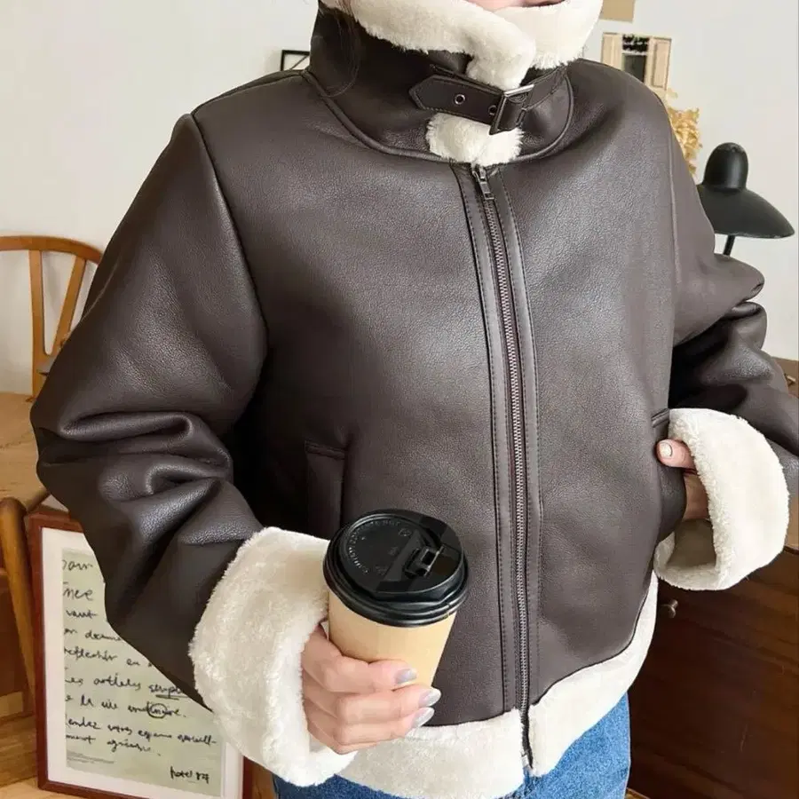 [새상품급] moment+ 인조 가죽 x 인조 모피 무스탕 숏 블루종