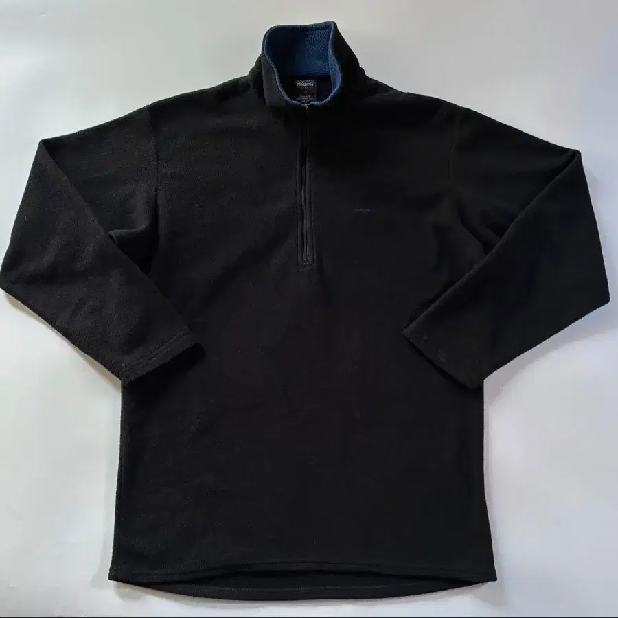 가슴에는 자수로 새겨진 [patagonia] 원 포인트 로고가 있습니다. 블랙 바디에 블루 색상으로 은은하게 새겨진 로고입니다.