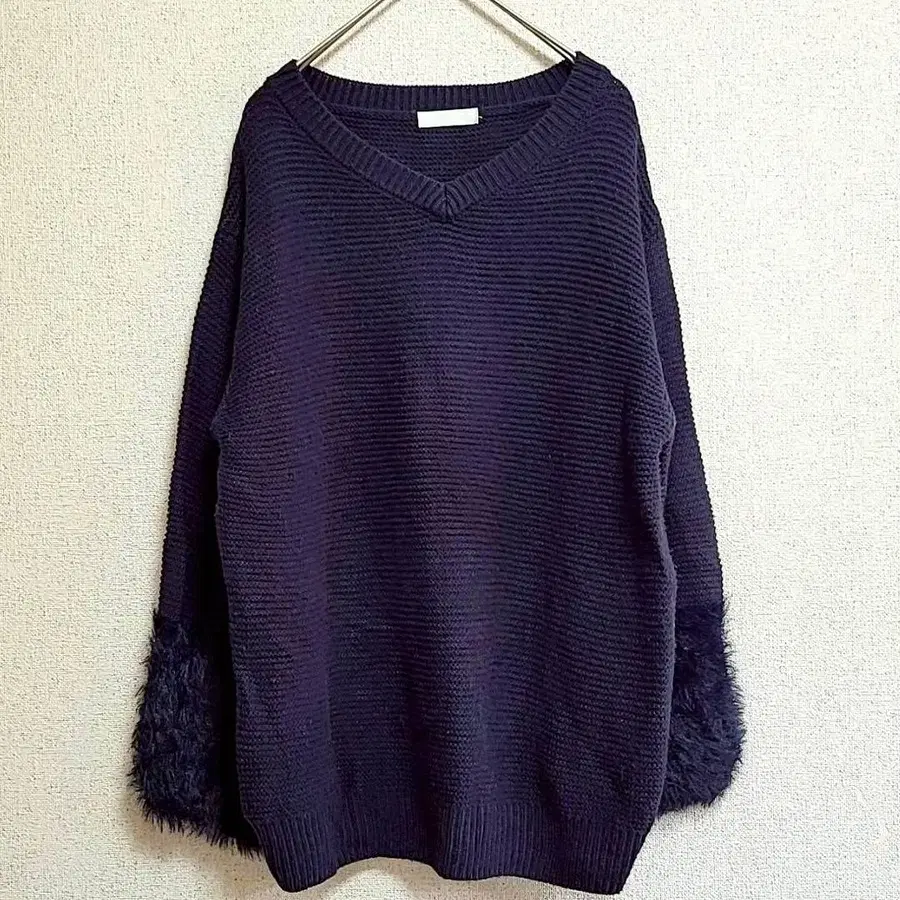 드레스킵 니트 스웨터 네이비 M 소매에 퍼 상의 V넥