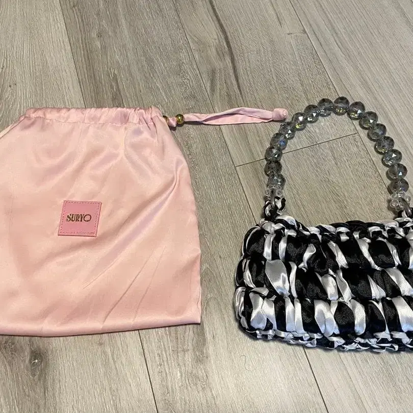 모노톤 컬러의 대비가 눈길을 끄는 백입니다. 새틴 리본의 크로셰 뜨개질로 표정이 풍부하게 만들어졌습니다. 존재감 있는 비즈 핸들도 포인트입니다. 다른 곳에서는 볼 수 없는 위트 넘치는 디자인이 매력적인 제품입니다.