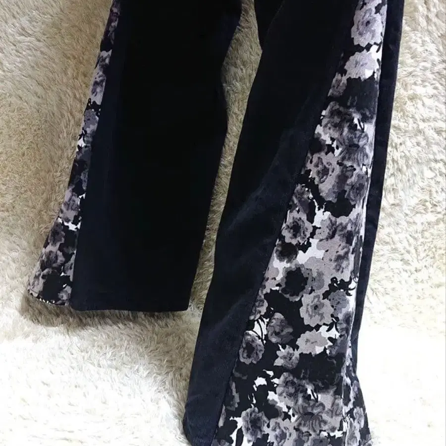 자동 번역되었어요. 원문보기리메이크 블랙 데님 재구축 도킹 플레어 팬츠 꽃무늬