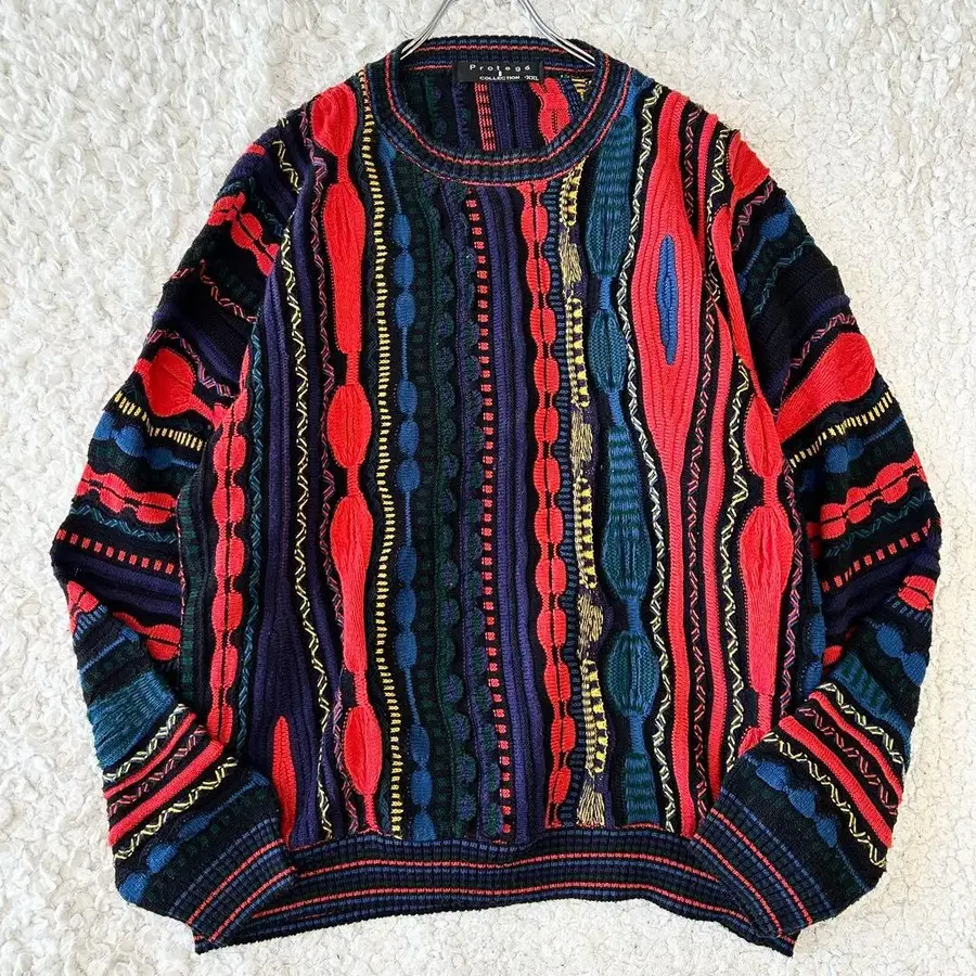 PROTEGE COLLECTION 미국제 총무늬 니트 3D 니트 스웨터 XXL 구제 의류 입체 자수 스트라이프 빨간색 레드 오버 사이즈 미국제 컬러풀