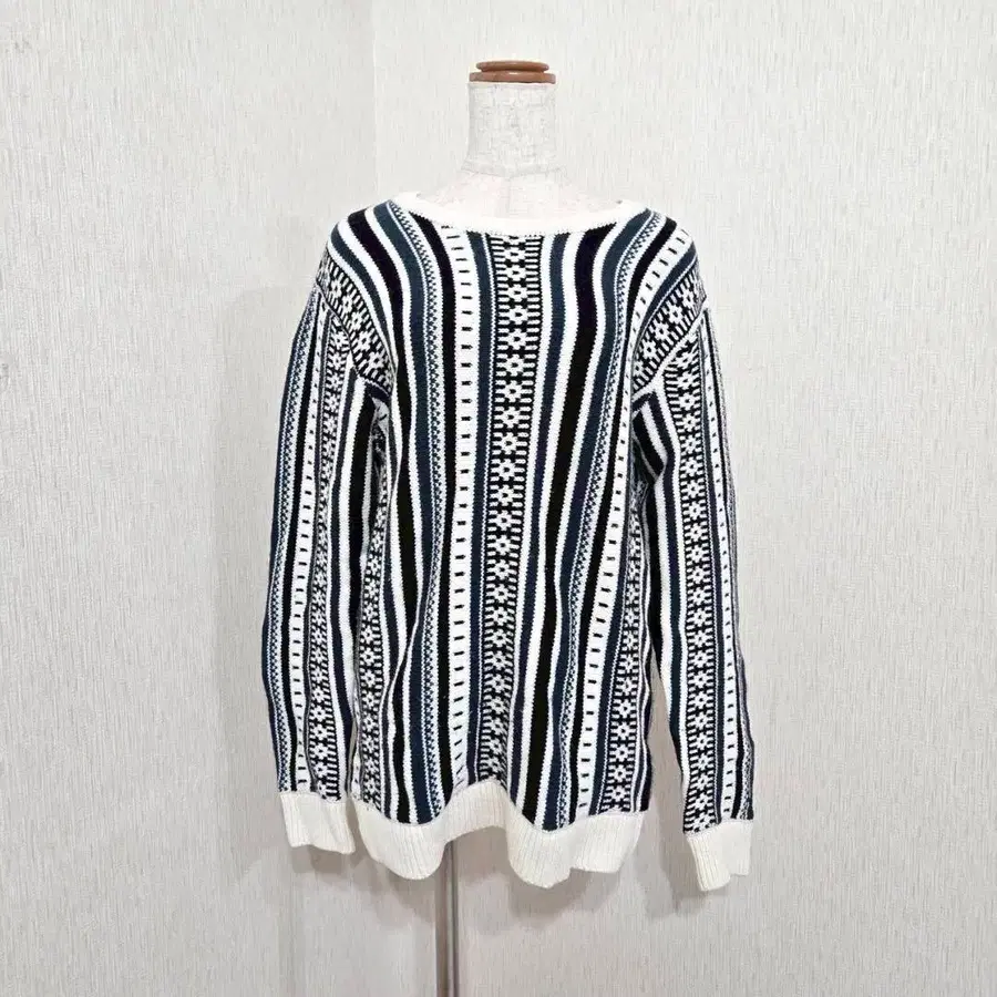 블랙 x 그린 x 화이트의 배색이 인상적인 RAGEBLUE의 올 패턴 니트. 스트라이프와 기하학 패턴을 조합한 디자인으로, 세로 라인이 강조되어 스타일리시한 느낌을 줍니다. 아크릴 x 울 혼방 소재로 가벼움과 적절한 보온성을 겸비하여, 가을/겨울 코디의 주인공으로 활약합니다. 보트넥에 가까운 네크라인 디자인으로 이너와의 레이어드도 용이하며, 구제 의류 믹스나 모드 스타일에도 추천하는 아이템입니다.