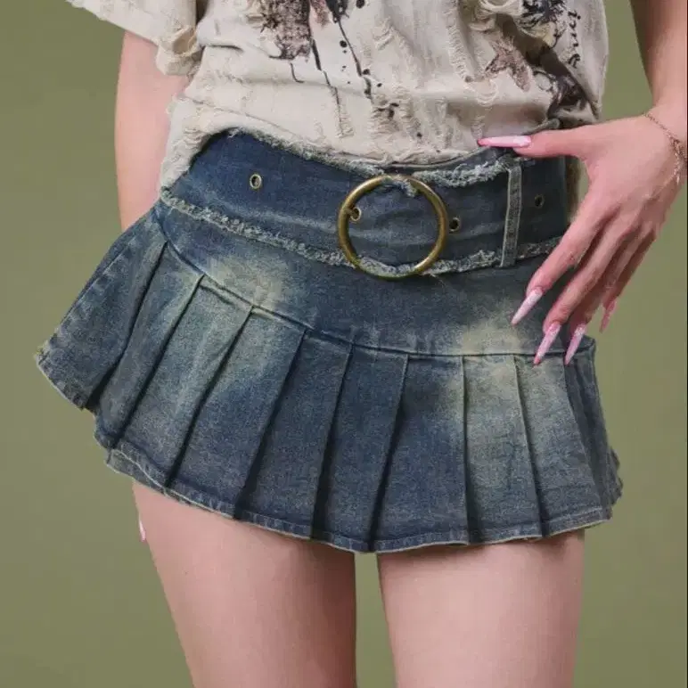 디스파크 데님 플리츠 미니 스커트 벨트 포함