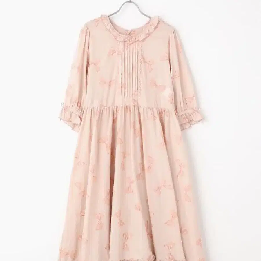 핑크하우스 리본 무늬 프릴 옷깃 긴팔 원피스 핑크