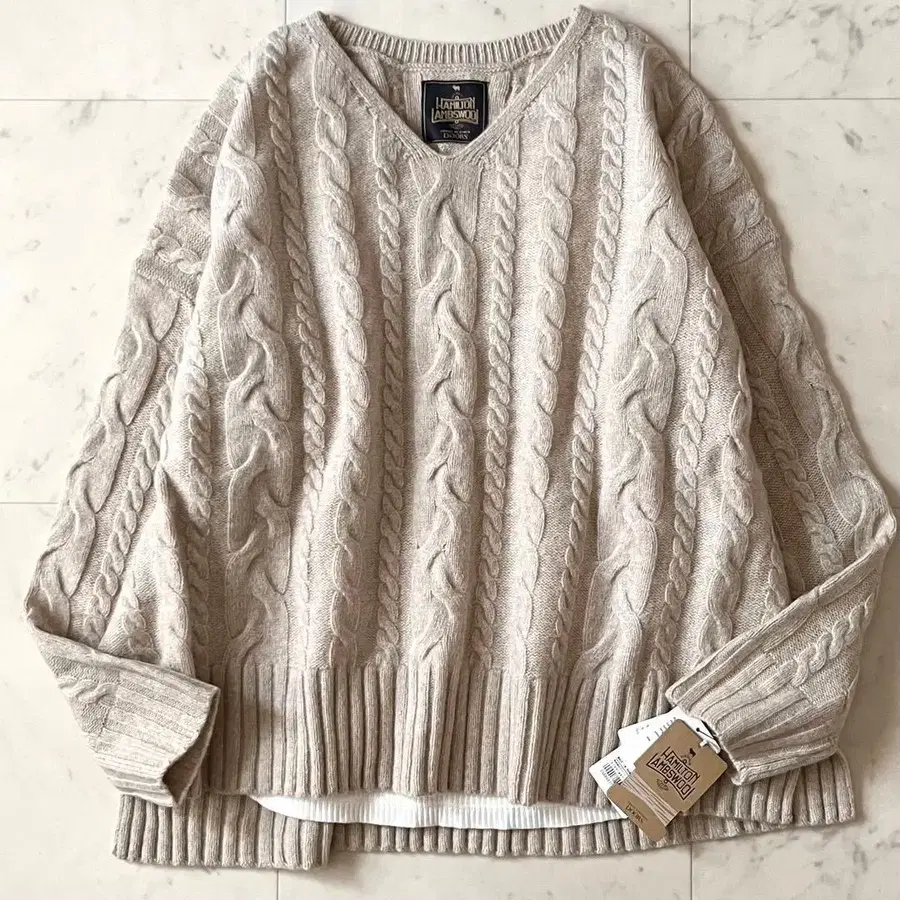 ADAWAS 베이지 아란 니트 V넥 스웨터