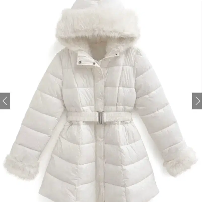 자동 번역되었어요. 원문보기후드와 퍼가 달린 화이트 다운 자켓, 벨트로 실루엣을 조절 가능.