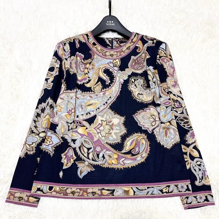 레오나르 티셔츠 페이즐리 꽃무늬 울 실크 트리밍 네이비 L