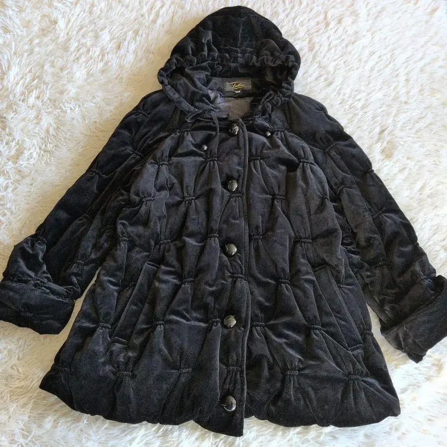 후드 부착된 블랙 코트, 벨로아풍 원단으로 따뜻함과 스타일을 동시에. 충전솜 포함