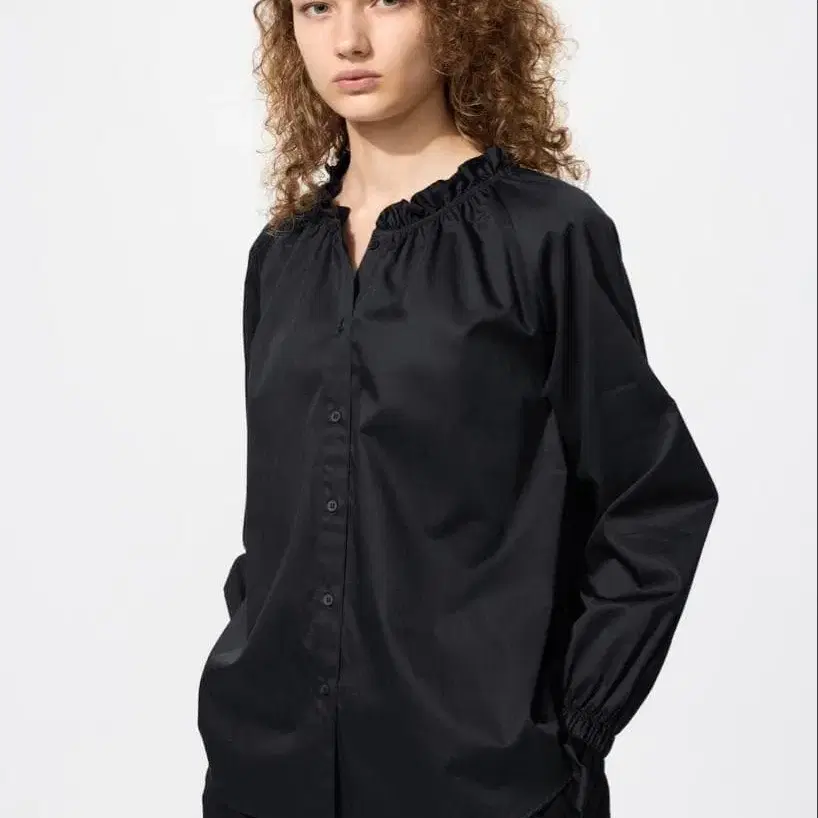 [ 새상품 ] 새틴 코튼 프릴 셔츠 S 블랙 유니클로 콩트와르 데코토니에