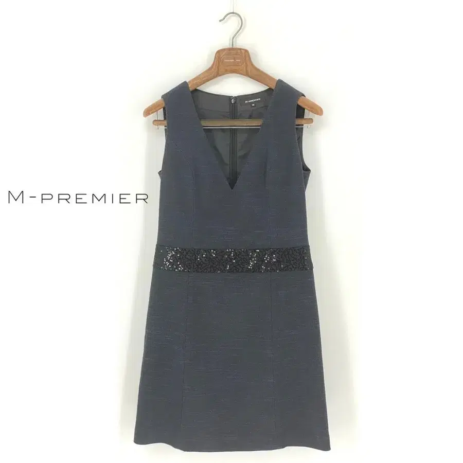 B0111/컨디션 최상 M-PREMIER 엠프리미어 레이온 트위드풍 스팽글 장식 슬리브리스 드레스 무릎 기장 원피스 38 M 네이비 여성용