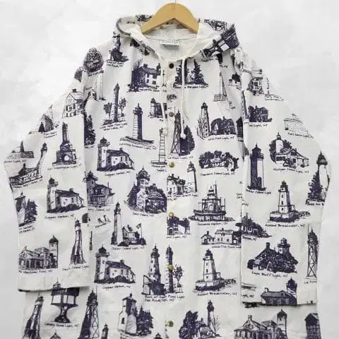 미시건 러그 코 빈티지 올 패턴 등대 프린트 버튼 업 후드티 M