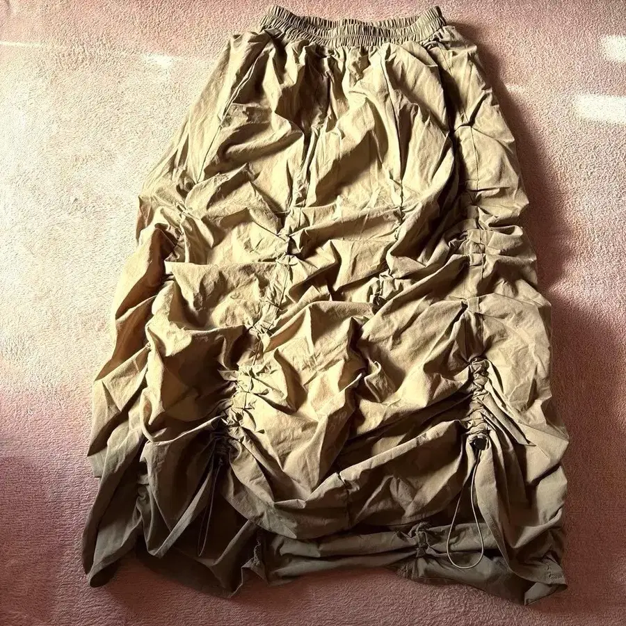 베이지 카키색 롱 스커트 개더링 패션