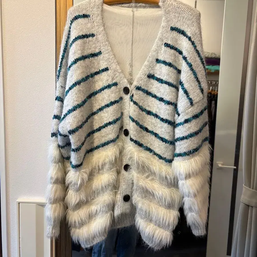 퍼가 달린 그레이와 파랑 스트라이프 니트 가디건