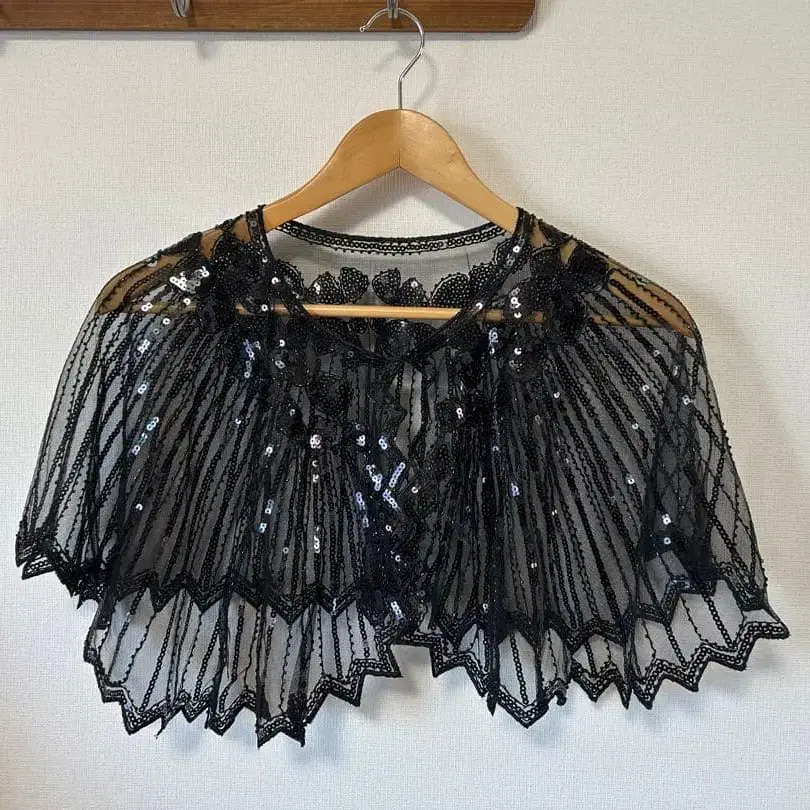 자동 번역되었어요. 원문보기스팽글 장식의 블랙 레이스 숄, 엘레강트한 디자인으로 특별한 장면에 최적.