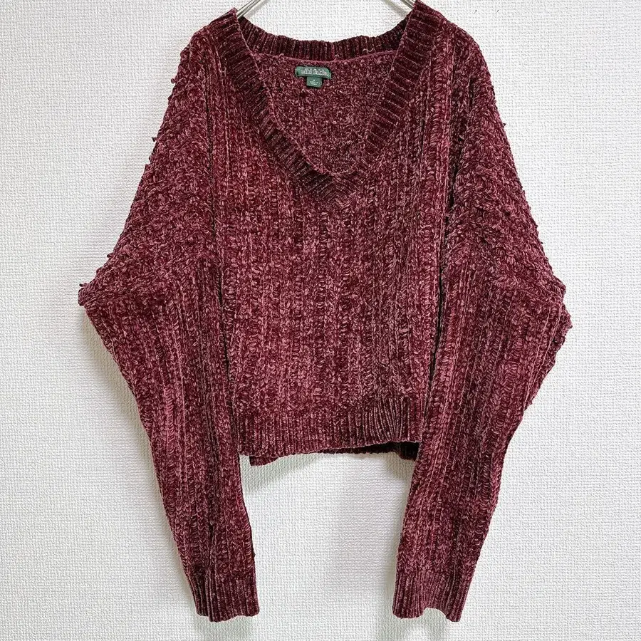 자동 번역되었어요. 원문보기와인 레드 오버사이즈 V넥 스웨터, 리브 디자인.