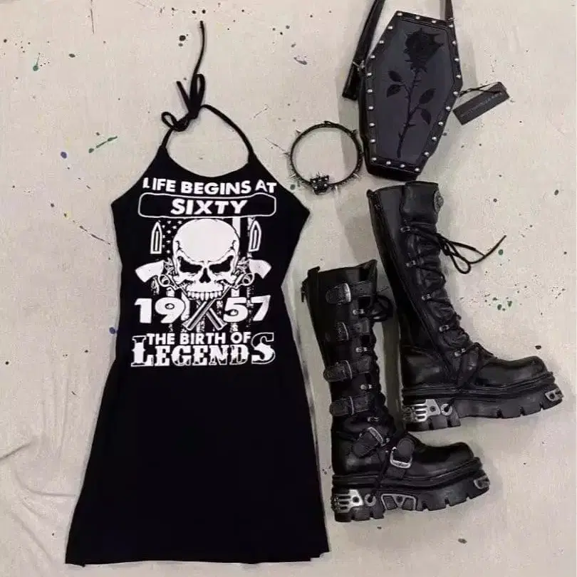 헤이세이 갸루 00s 스컬 프린트 슬리브리스 미니 원피스 Y2K