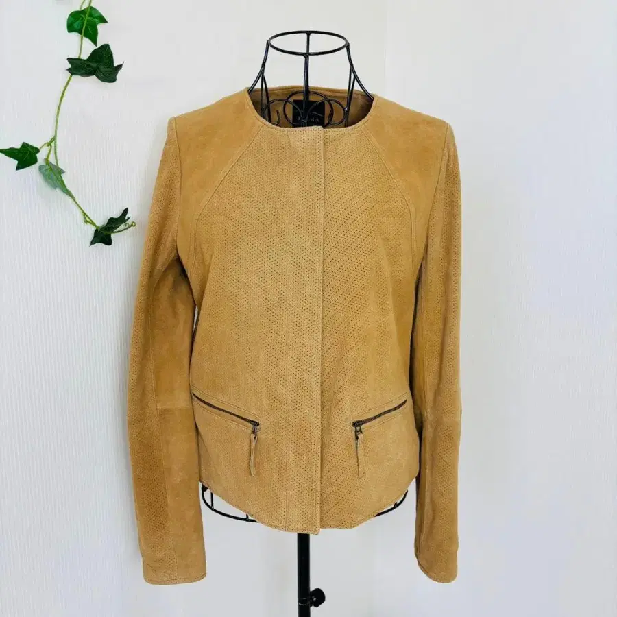 자동 번역되었어요. 원문보기스웨이드 소재의 베이지 집업 자켓, 전면에 지퍼 포켓 부착.