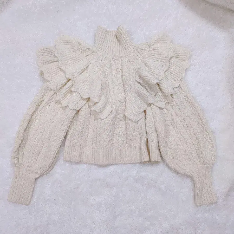 새상품급 ZARA 퍼프 슬리브 크롭 기장 굵은 케이블 프릴 니트 아이보리