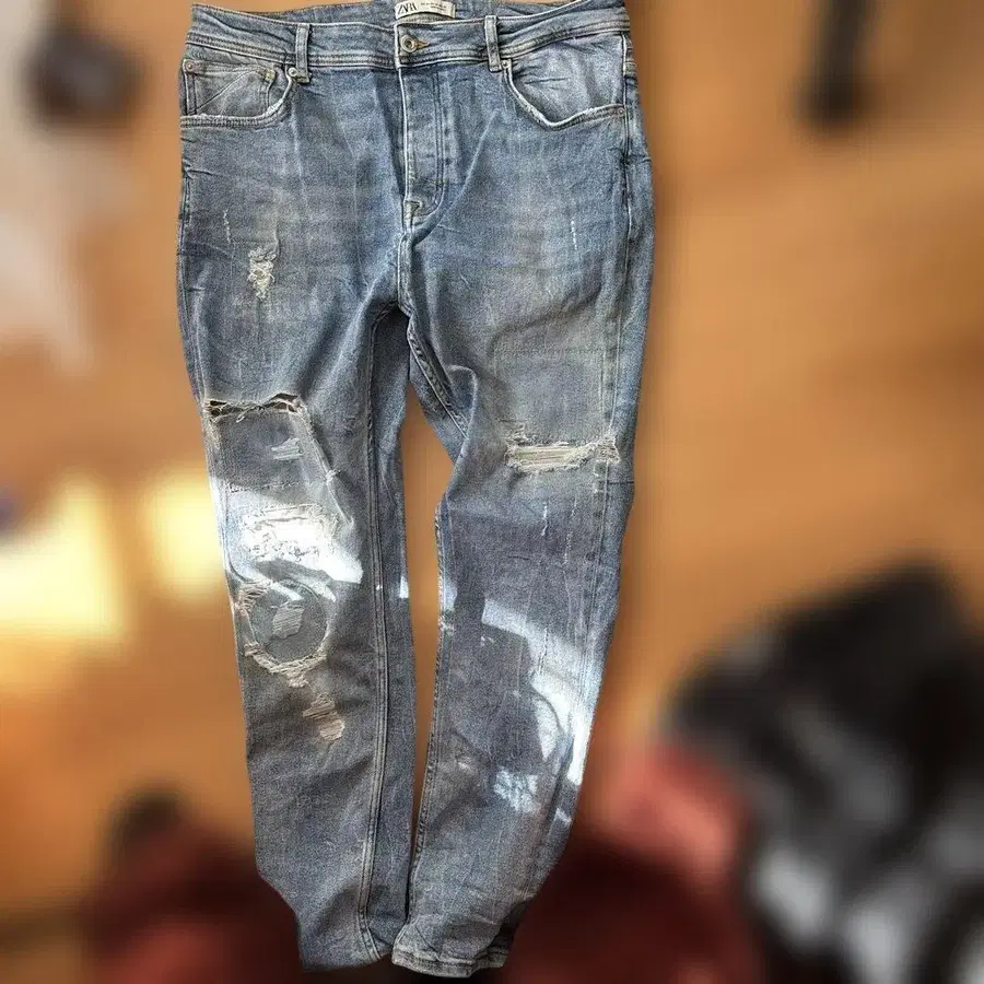 데미지 가공 스키니 데님 라이트 블루