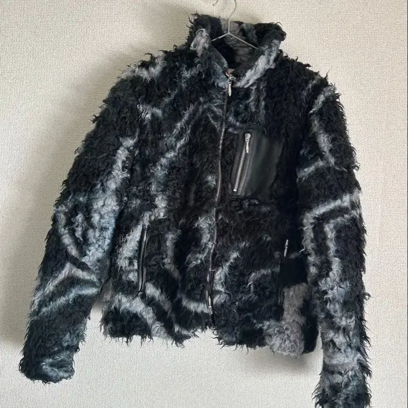 자동 번역되었어요. 원문보기퍼 소재의 블랙 그레이 계열 자켓, 지퍼 포켓 있음.