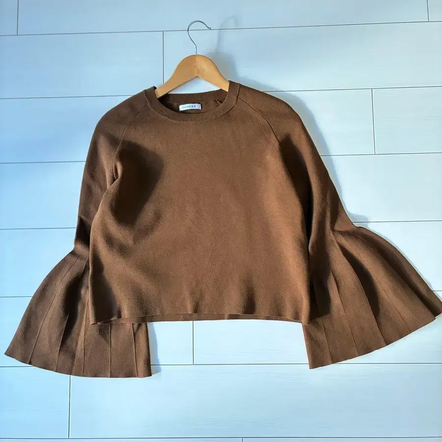 벨 슬리브 플레어 슬리브 소매 프릴 플리츠 크루넥 긴팔 하이 게이지 니트 밀라노 리브 원단 스트레치 원단 신축성 있음 고급 원단 스타일업