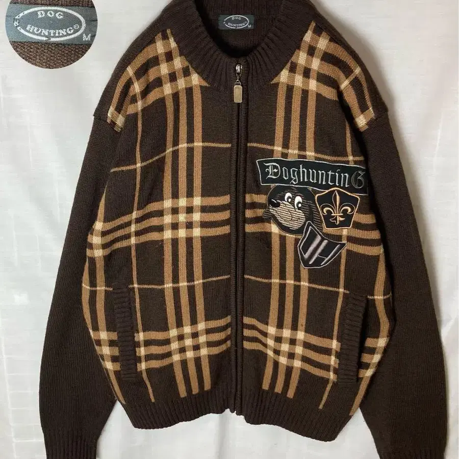 레트로 구제 의류 애니멀 자수 x 브라운 빅 체크 니트 블루종