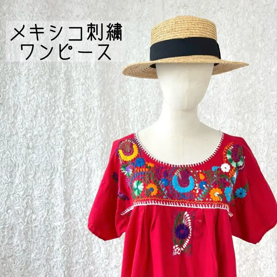 멕시칸 자수 빨간색 원피스 꽃 자수 반팔 롱 빈티지