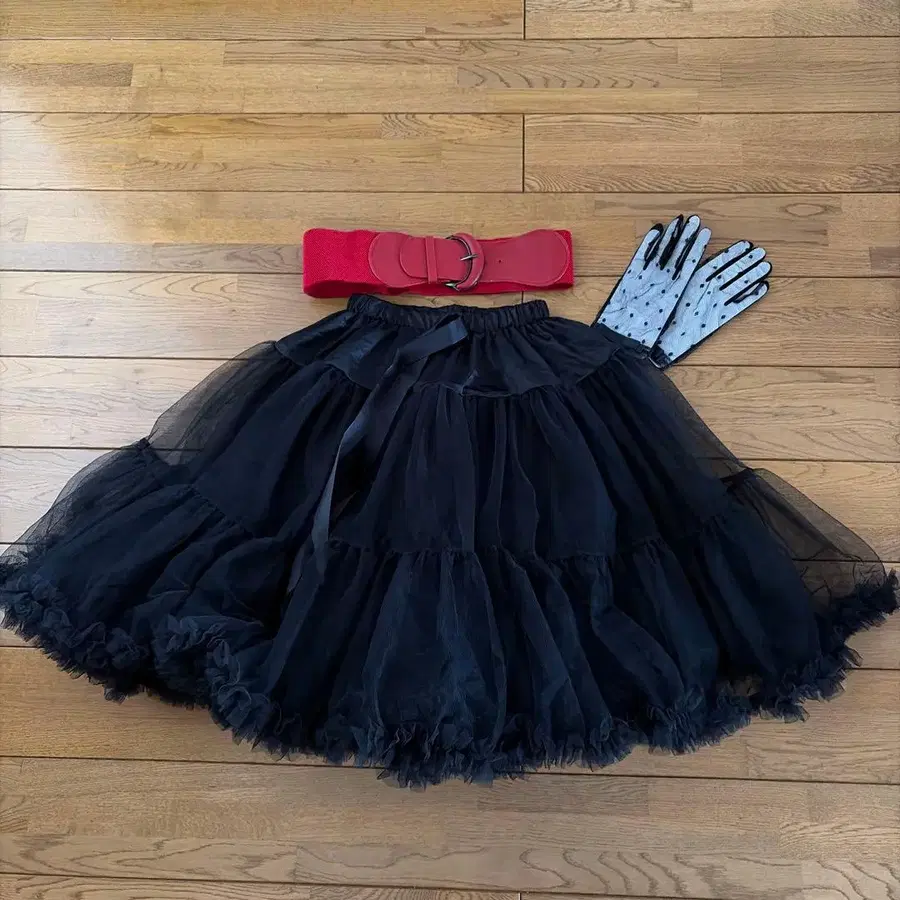 블랙 튤 스커트와 빨간색 벨트, 장갑 세트