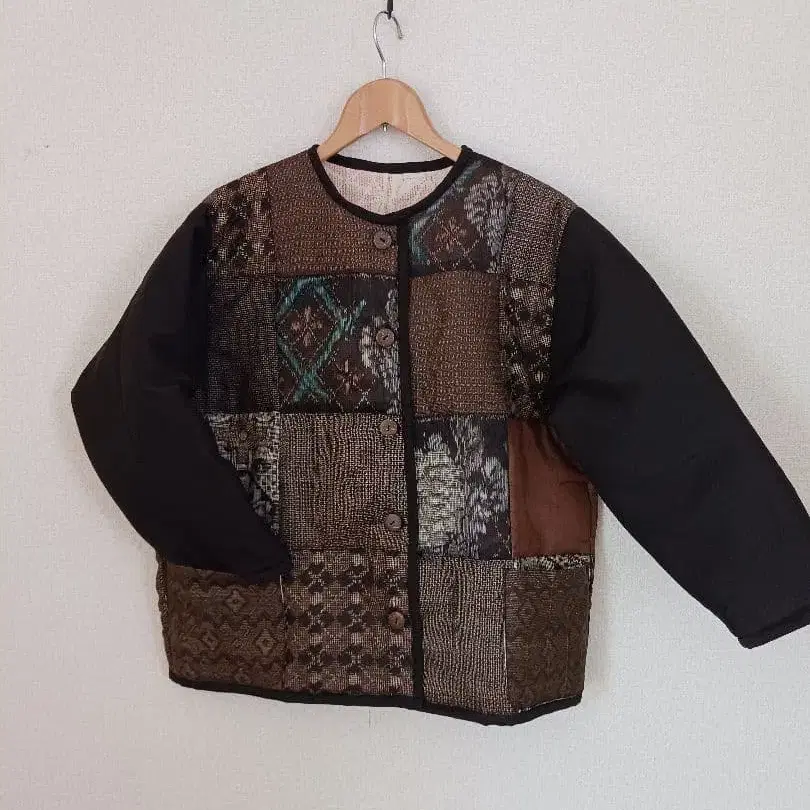 패치워크 디자인 노카라 자켓
