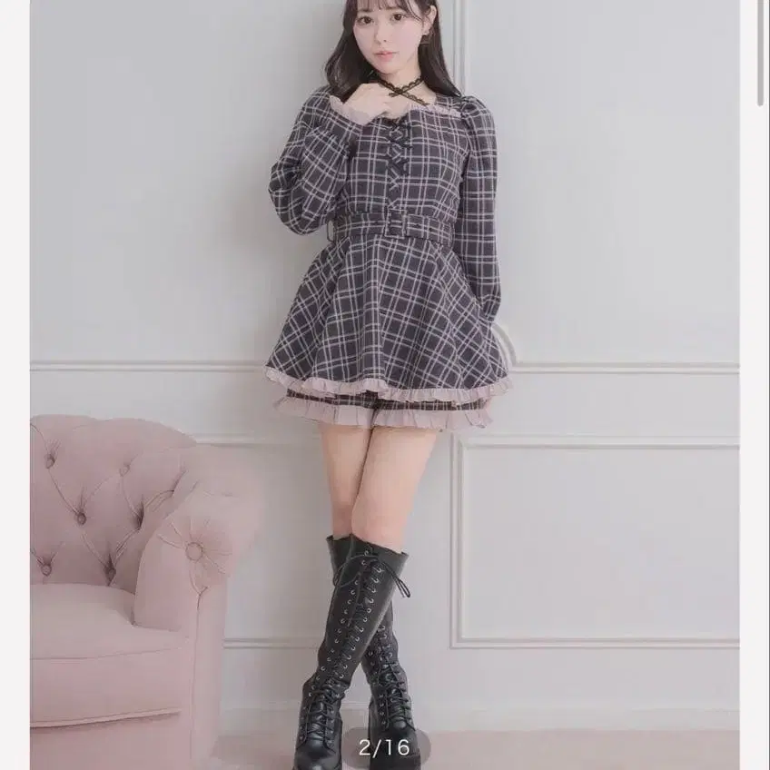 pium 프론트 리본 프릴 셋업 블랙 체크