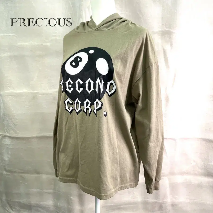 앞면에 큰 8볼 그래픽과 [ SECOND CORP. ] 글자가 프린트되어 있습니다. 색상은 카키색입니다. 넉넉한 실루엣에 후드가 달려 있습니다.
